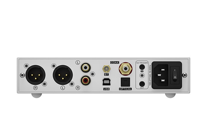 背面にはXLR/RCA出力を搭載。固定または可変ボリュームモードを選択でき、据え置きオーディオシステムに組み込んだり、アクティブスピーカーを直接繋いで再生することが可能。入力端子はUSB/光デジタル/同軸デジタルを備え、またBluetooth入力にも対応。コーデックはLDAC/aptX Adaptive/aptX HD/aptX/AAC/SBCをサポートする。ほか、他の機器と連動させるための12VトリガーIN/OUTを備える。