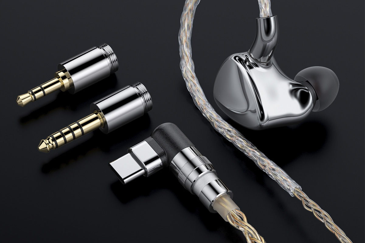 付属のケーブルは、360芯8編組の金/銀/銅ハイブリッドケーブルをリッツ構造で採用。それぞれ異なる長所を持つ素材を組み合わせることで、音質の相乗効果を狙っているという。コネクターはMMCX。プラグは着脱可能で、3.5mmシングルエンド/4.4mmバランス/USB Type-Cの交換用プラグを用意する。