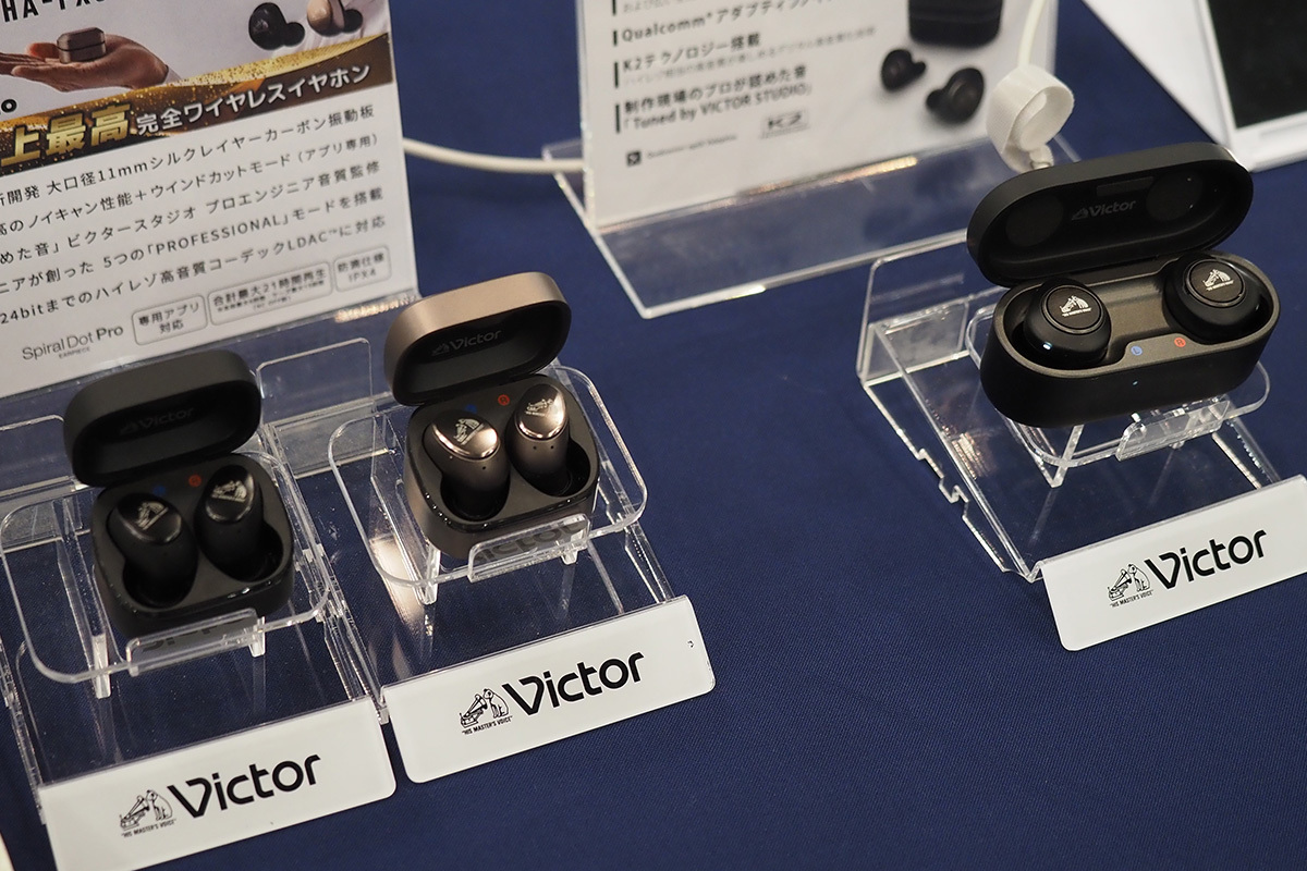 JVCケンウッドは、ビクターブランドの完全ワイヤレスイヤホンを集めて試聴ブースを展開。透け感のあるシアーデザインが特徴のノイキャン対応モデル「HA-A22T」を中心に、イヤーカフ型の “ながら聴き” モデル「HA-NP1T」や、シルクレイヤーカーボン振動板を採用した「HA-FX550T」など、現行の主力製品を手に取って体験できる。