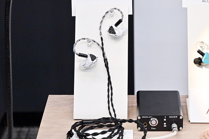 飯田ピアノは、ベトナムSoranikブランドから発売予定の「MEMS-3S 2025」(予価約44万円)を参考出展。口径の異なる2基のダイナミックドライバーに加え、xMEMS社とUSound社という異なるメーカーのMEMSドライバーも組み合わせたハイブリッド設計となっている。