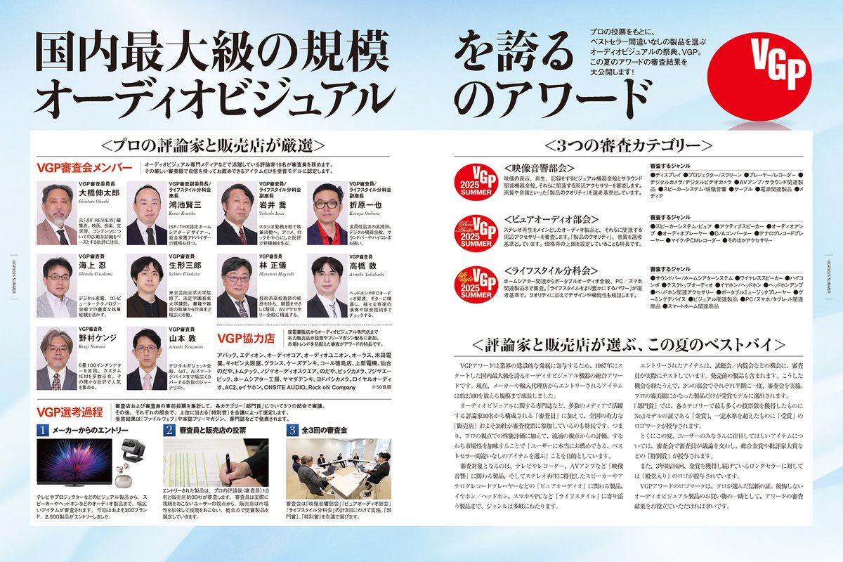 国内最大級を誇るオーディオ・ビジュアル機器の総合アワード「VGP」。最新のVGP2025 SUMMERの受賞結果を掲載したフリーマガジン「VGP受賞製品お買い物ガイド2025夏版」の配布を、ヨドバシカメラ、ビックカメラ、その他協力店舗にて、7月15日より順次開始しました。