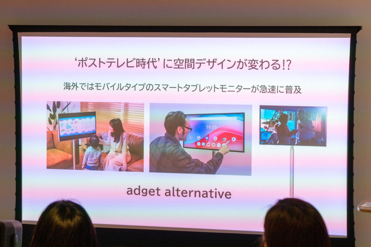 「持っているだけでワクワクするような体験を、一人で過ごす時間、大切な人と過ごす時間に彩りを」与えるアイテムの開発をモットーに、“IRODORI YOUR LIFE”をコンセプトとしたガジェットブランドであるAdget(アジェット)からは、スタンド付きスマートタブレットモニター「Alternative」を紹介。