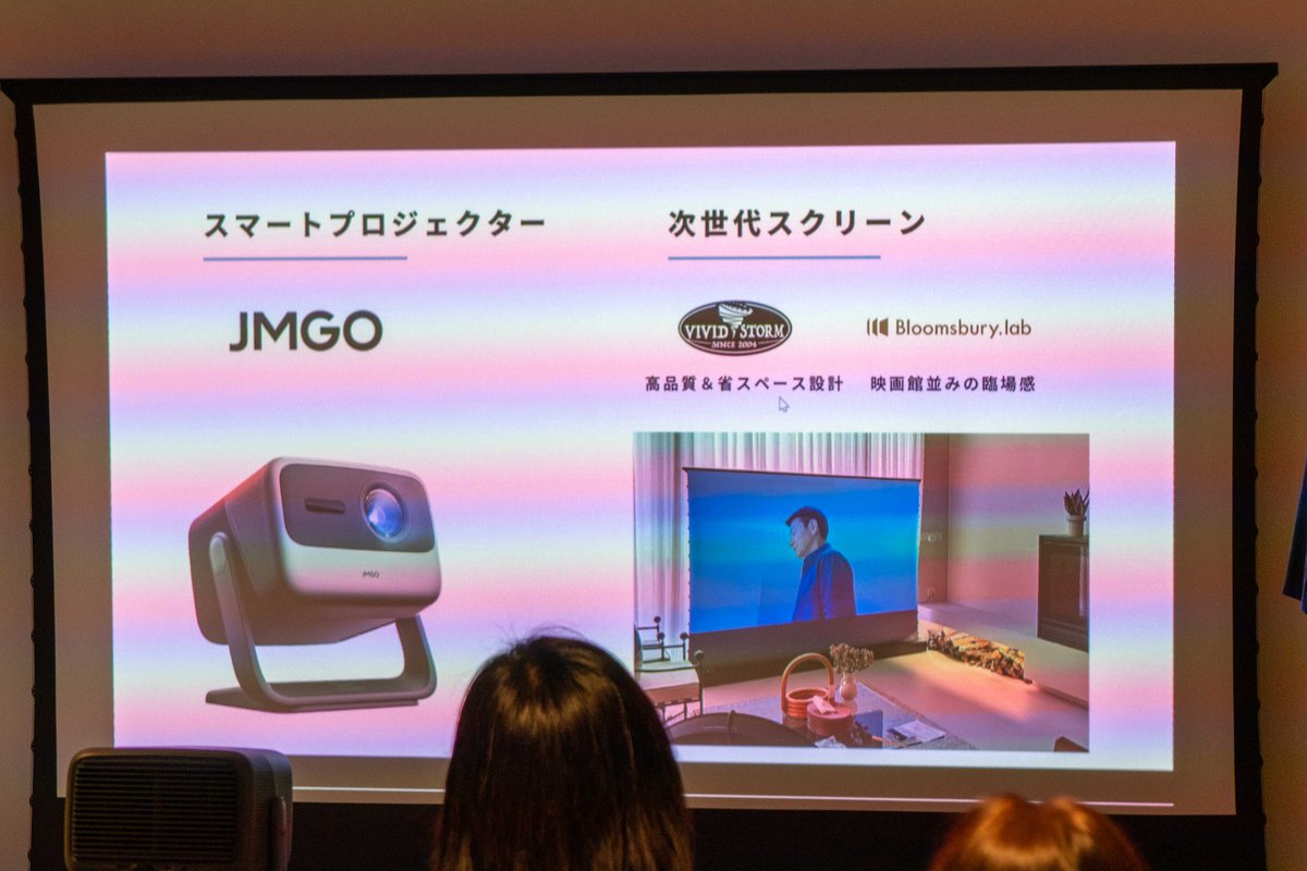 リビング/ダイニングをイメージしたシーンでは、JMGOのハイエンド・4KプロジェクターであるN1S Ultimate 4KとBloomsbury.labのスピーカー内臓スクリーンのLiberty Wideを組み合わせて展開。プロジェクターは暗室で観るイメージが強いが、明るい照明下でも色鮮やかでコントラストのハッキリとした映像が映し出せることをデモンストレーションしていた。