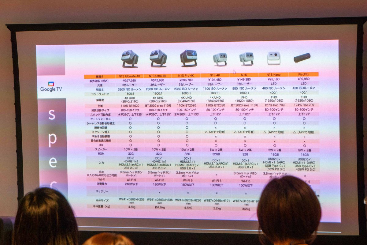 多数のプロジェクターをラインナップしており、4Kプロジェクターでは「N1S Ultimate 4K」「N1S Ultra 4K」「N1S Pro 4K」「N1S 4K」、フルHDプロジェクターでは「N1S」「N1S Nano」といった、幅広いユーザー層に向けたジンバル一体型プロジェクターを用意する。そして、ボトル型のコンパクトサイズで角度調整も簡単に行えるプロジェクター「PicoFlix」も備えている。