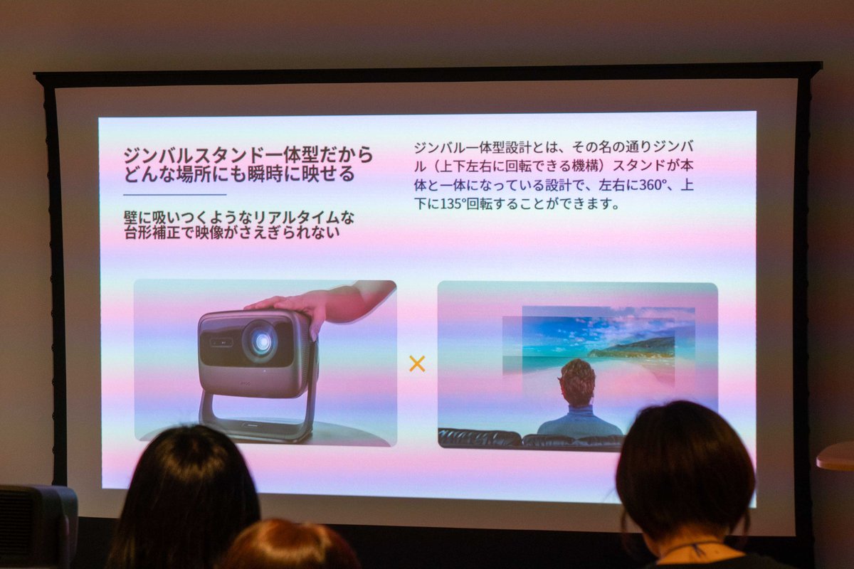 「コンパクトなスクリーンは、家のなかでも持ち運び、ユーザー自身で使用シーンを変えて使いそうだから、台形補正やフォーカス合わせが、プロジェクターを置いたらすぐに起動するのは便利だった。また、自動で障害物を避けて映像を映し出す機能や、壁紙が白以外でも最適な映像にする機能は、細やかな部分にも配慮してくれているという印象だった」