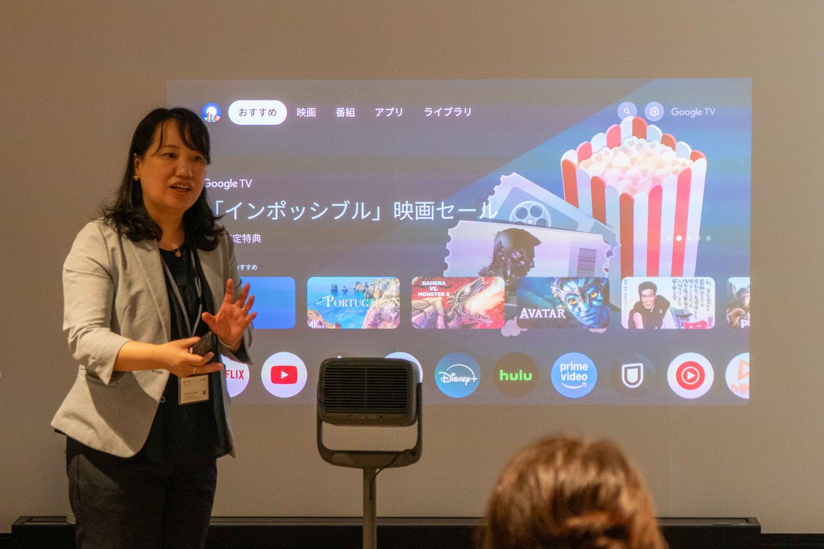 また、プロジェクターにGoogle TV OSが搭載されているため、他の機器と繋げることなくプロジェクター1台でVODサービスやさまざまなアプリを楽しめることもアピールする。ほかにもHDMI端子を装備していることから、ゲーム機と接続して大画面でゲームプレイを楽しむシーンを演出。映画やドラマなどを視聴するスタイルだけでなく、遊び方の幅も広がることも紹介していた。
