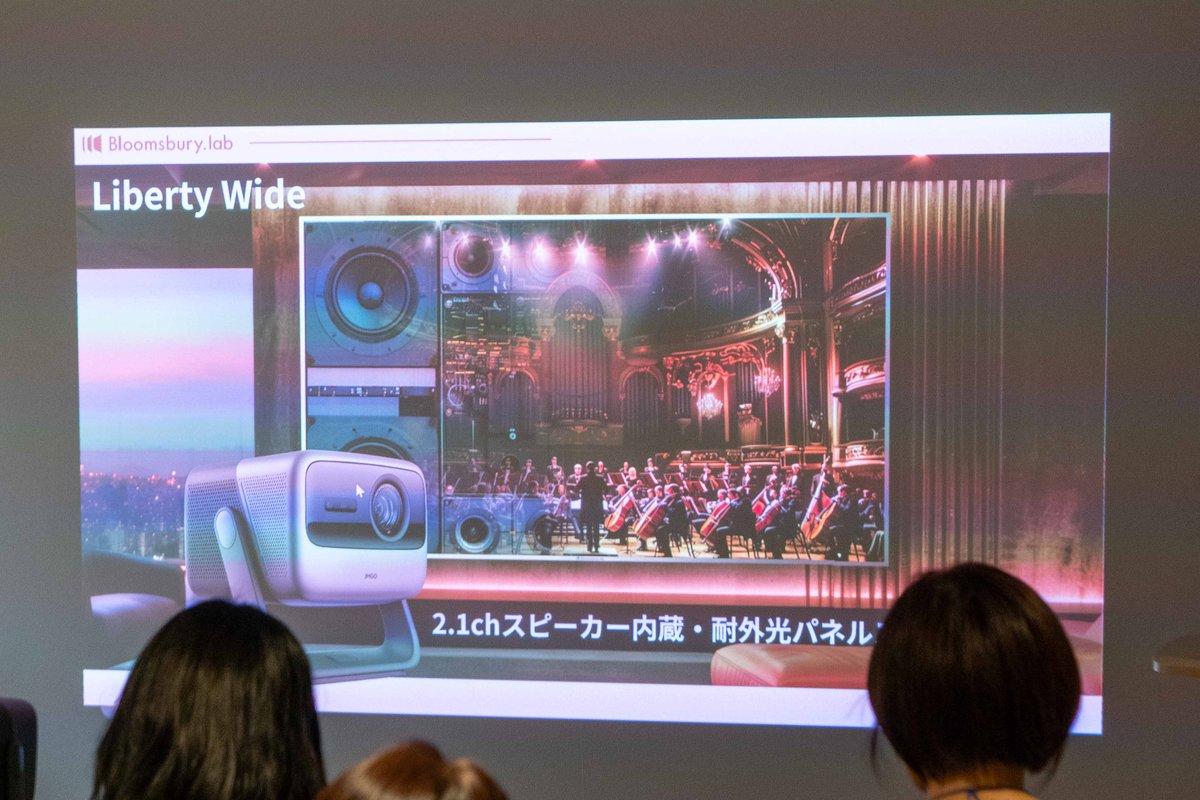 なかでも「Liberty Wide」は、耐外光パネルスクリーンとなっており、さらに2.1chスピーカーを内蔵するモデルだという。明るい部屋でも鮮やかな映像が投写できるよう、環境光抵抗材質の使用、正面と下からの光だけを反射させる「CLRパターン」を採用するなど、高い技術力を導入。