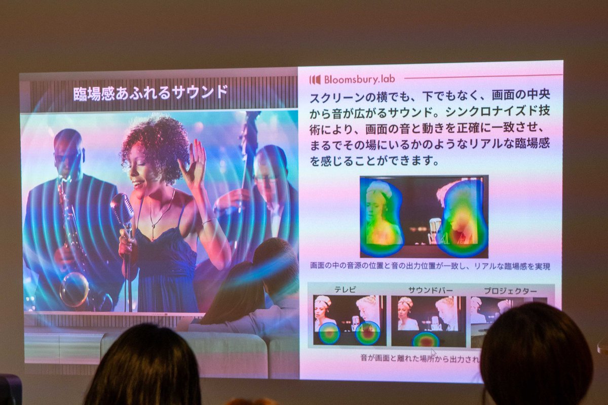 最大の特徴は、画面の中央から音が聴こえるようにする「シンクロナイズド」技術によって、スクリーンに投写されている映像と音の動きを正確に一致させる高音質技術を搭載している点。スクリーンとスピーカーが一体構造であるからこそ成し得る技術である。