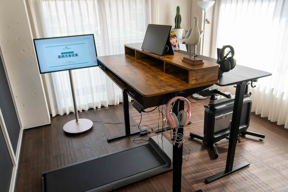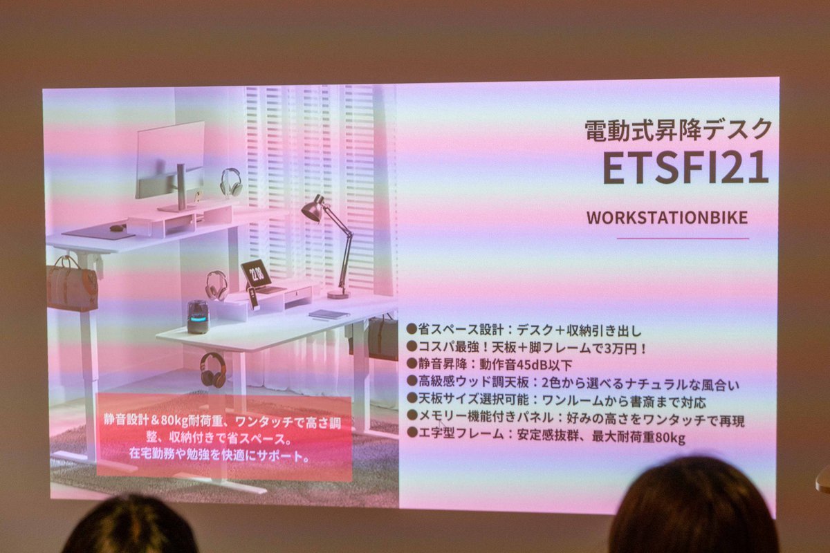 ほかに“ホームオフィス”に関連するブランドも取り揃えており、WALKINGDESKからは折りたたみ式デスク付きフィットネスバイク「EBW1B」を始め、ガス圧昇降式を採用することでスムーズな高さ調整が可能な昇降式サイドテーブル「ETD2」、静音設計+80kg耐荷重に加えコストパフォーマンスの高さも特徴の電動式昇降デスク「ETSFI21」といったアイテムを取り揃えている。