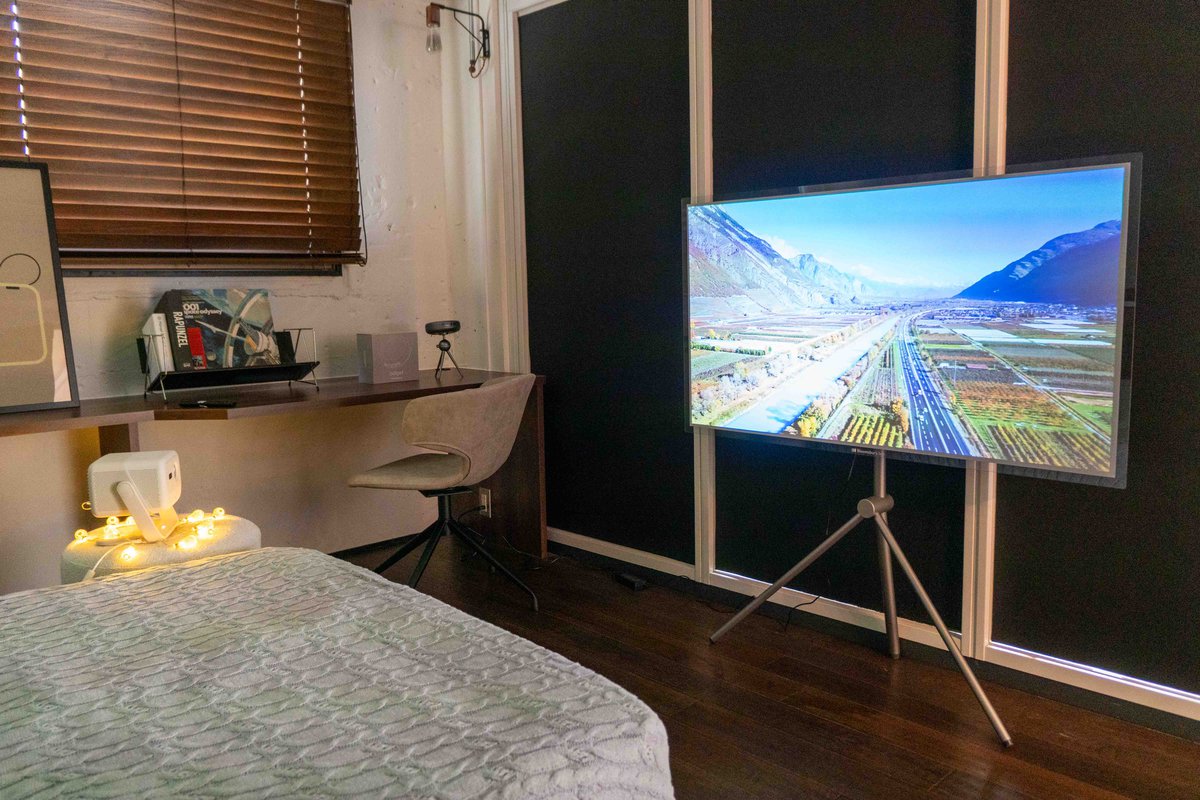 ベッドルームでは、N1S NanoとBloomsbury.labの中サイズのスクリーンも展示。JMGOブランドのプロジェクターは自動台形補正/オートフォーカスといった設置性に優れた機能も備えているため、プロジェクターを斜めの位置から投写してもスクリーンに映像をフィットさせることができ、設置場所が限られている空間においても導入しやすいメリットを演出した。