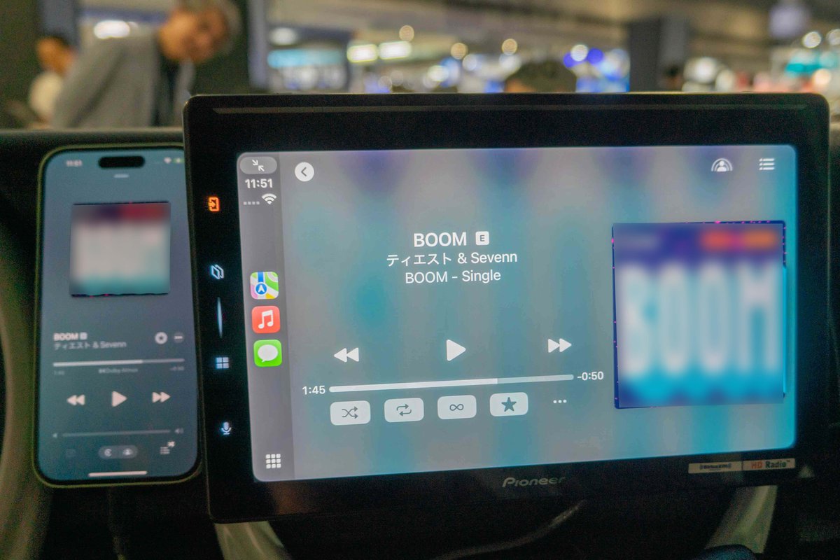 デモンストレーションでは、Apple CarPlayによってDolby Atmos音源を再生。TIËSTO & SEVENN 「BOOM」を試聴したが、フロントLRとサラウンドLRしかスピーカーがない平面的なシステムにも関わらず、車内全体を包み込むような、高さ方向からも音源の空気感が感じられる音場が再生されていた。