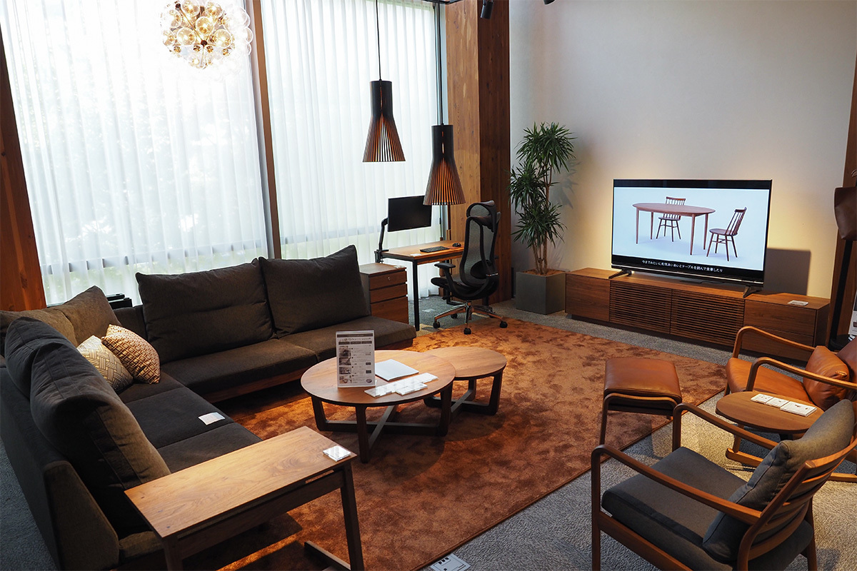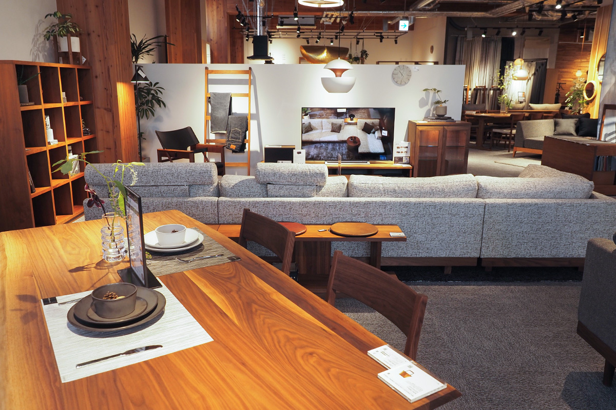 店内は高い天井と木でできた柱が特徴的な空間。リビング/キッチン/ダイニング/書斎/ベッドルームなど、さまざまシーンに合わせてコーディネートされたソファ/チェア/テーブル/ベッド/インテリアなどを体験できる。