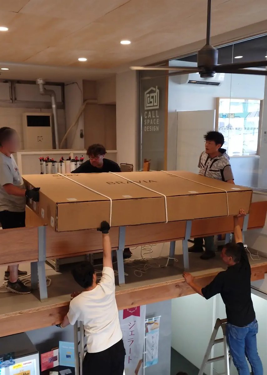 梱包重量はなんと94kgになるそうだが、「普通ならとんでもない重さと思われるかもしれません。しかし、ブラウン管時代からの電気屋であれば、『あぁ、36型のブラウン管テレビよりちょっと軽いくらいね。2人いれば2階まで持ち上げられるね』というイメージがすぐに頭に浮かんできます」。実際、5人の男手による力技により、涼しい顔であっけなく搬入、設置されるまでの光景がブログでは動画も交えて紹介されている。