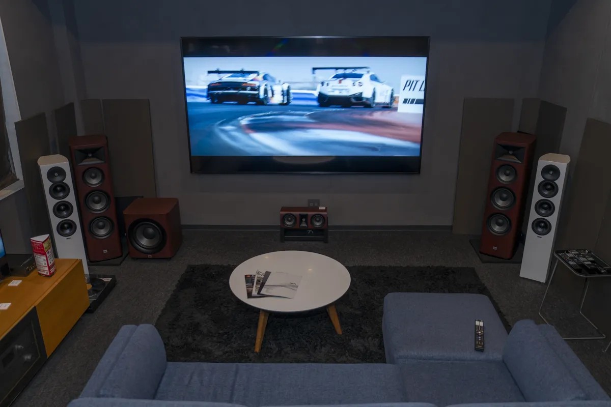 野田店長は、コール徳島店のシアタールームにも「実は、大きな出来事がありました」と打ち明ける。先ほども話に出たソニー国内初となる98V型テレビ、BRAVIA 5「K-98XR50」が、6月28日の正式発売を前に、シアタールームの常設機材として壁掛け展示・導入されたのだ。