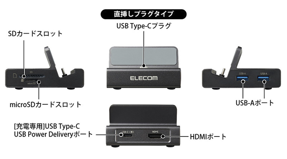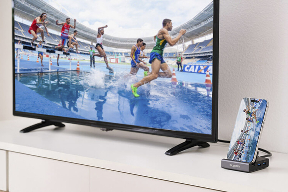 エレコム、スマホ画面をテレビに映せるスタンド型ドッキングステーション「DST-P060BPGY」