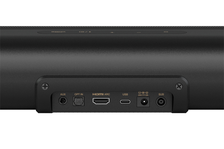 入力端子として、ARC対応HDMI、USB Type-C、光デジタル、AUXを各1系統ずつ搭載。SBCコーデックによるBluetooth入力もサポートし、入力機器は天面のボタンや付属リモコンからシームレスに切り替えられる。またHDMIおよび光デジタル入力はDolby Audioに対応しており、動画ストリーミングやゲームなどの対応コンテンツをより高音質でクリアに楽しめるとしている。USB入力は、PCM 48kHz/16bit 2chまで対応する。