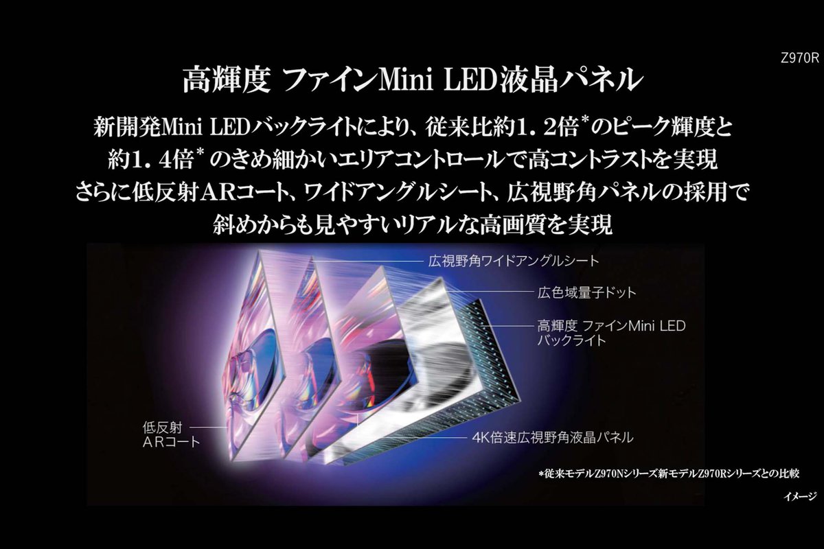 特に2025年モデルの最新の4K Mini LED液晶パネルを採用したZ9シリーズは、バックライトのエリア分割数も大幅に進化。65V型「65Z970R」は約2,000分割、75V型「75Z970R」は約3,000分割弱、そして85V型「85Z970R」は3,000分割を超えており、2024年モデルと比較しても大幅に分割数がアップしていると、シニアプロダクトマネージャーの槇本修二氏が特別に紹介してくれた。
