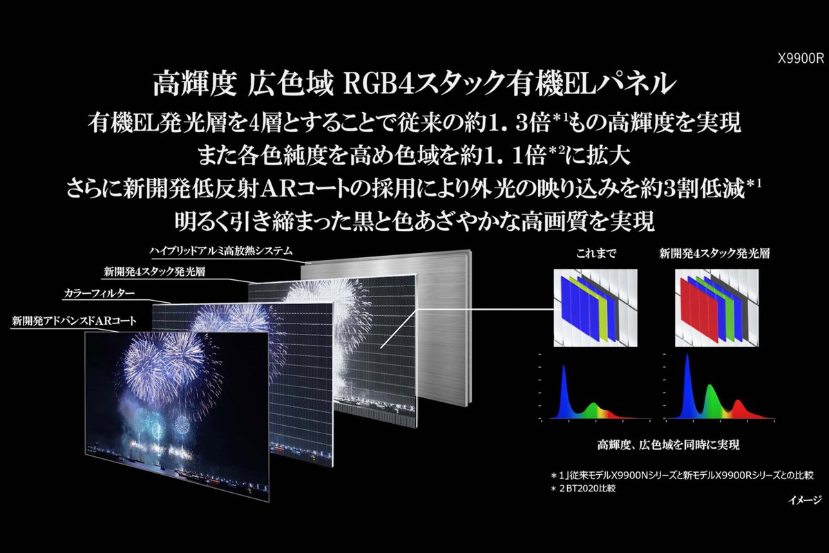 また、改めて4K有機ELテレビ「X9シリーズ」の特徴である「高輝度広色域 RGB4スタック有機ELパネル」が搭載されている点について紹介。輝度と色域が進化していることがトピックであり、特にRGBの独立の発光層を持たせることが可能になったため、色純度を高めたことが従来以上の広色域化に繋がったという。そして、RGBの画素だけで1,000nitsの明るさを実現しており、白い画素で明るさを補う必要がなくなり、自然な色再現のまま高輝度表現も叶えている。