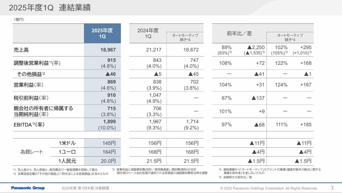 パナソニックホールディングスは、2025年度第1四半期決算説明会を開催。同社取締役 執行役員 グループCFO・和仁古明氏が説明を行った。