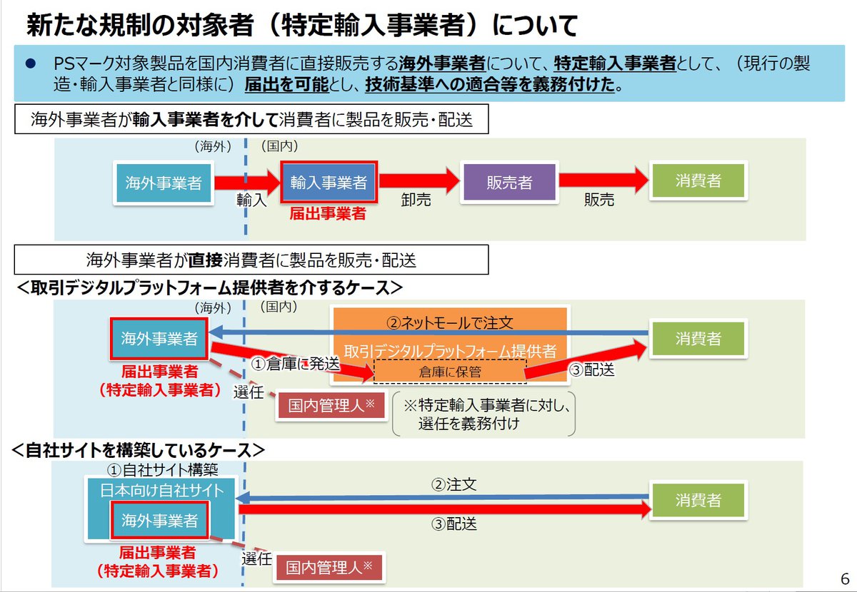 PSマーク対象製品を国内消費者に直接販売する海外事業者を「特定輸入事業者」として新たに規制の対象に位置付け、現行の製造・輸入事業者と同様に届け出を可能とし、技術基準への適合等を義務付けたもの。