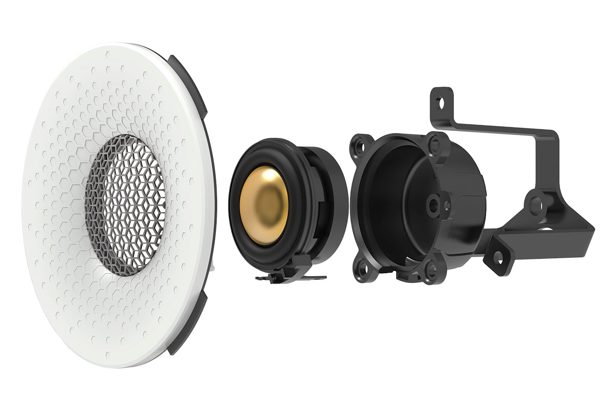 25.4mm径C-CAM Goldドームトゥイーター×1基、152.4mm径C-CAMバスミッドドライバー×2基を搭載する2ウェイ・バスレフ型のオンウォールスピーカー。