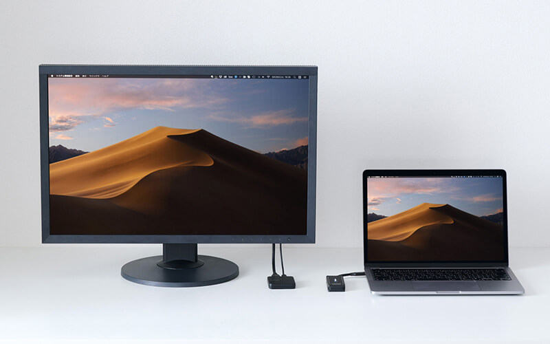 セットアップはつなげるだけの簡単接続で、アプリやドライバーなどの設定が不要。ワンタッチ接続で大画面への映像伝送を実現する。本体はコンパクト設計により持ち運びにも便利としている。