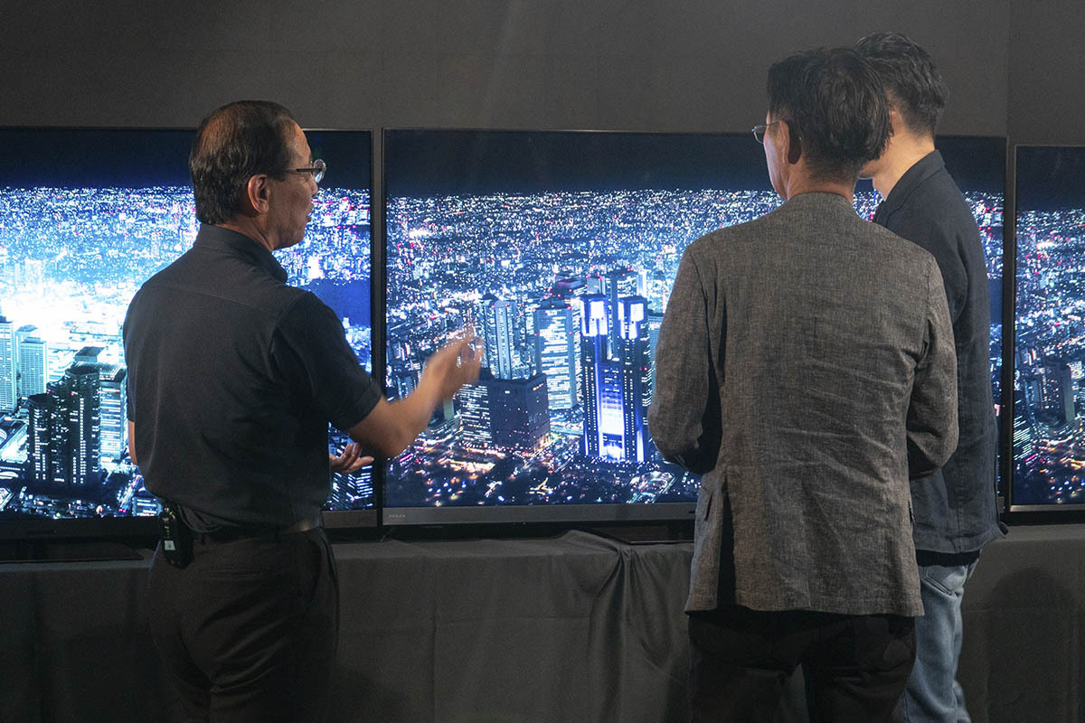 実際に夜景シーンを見比べて「黒の締まりが違う」と本村氏。小岩井さんも「低反射コート搭載の2モデルでは黒がしっかり締まって見えますね」と納得の様子。黒が締まることでコントラストが増し、映像のリアリティが向上するのだという。
