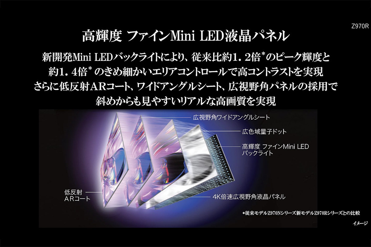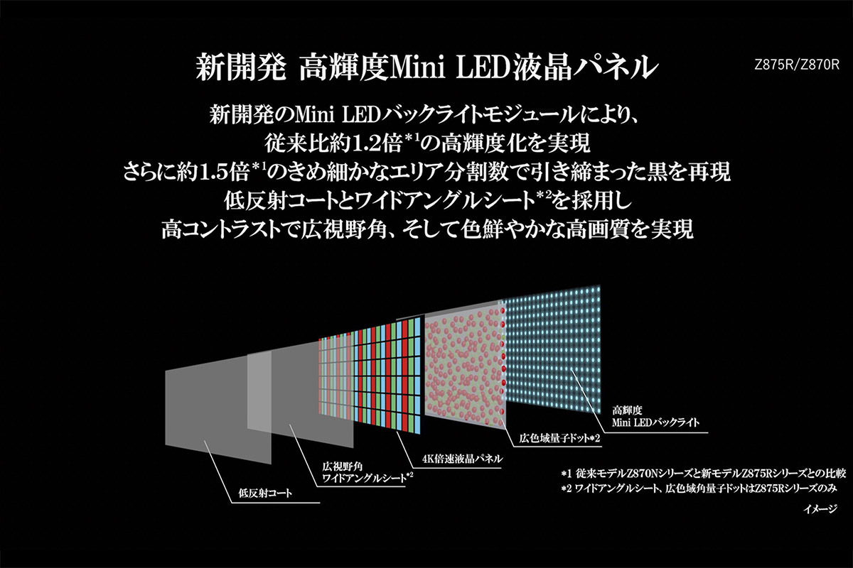 「Z7シリーズ」は通常のMini LED液晶テレビの表面処理だが、「Z8シリーズ」には「低反射コート」を、「Z9シリーズ」にはさらに高性能な「低反射ARコート」を採用している。TV映像マイスタの住吉氏によると、実際の数値上において「Z9シリーズ」が1%、「Z8シリーズ」が2%、「Z7シリーズ」が5%の反射率を実現しているとのこと。