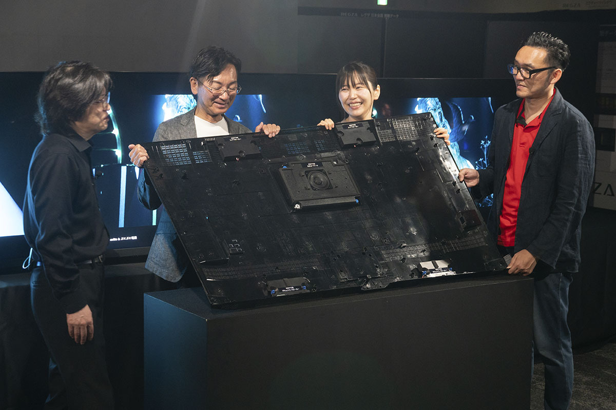 「65Z875R」のスピーカー鳴らすとまた感嘆の声。折原氏は「音の分離感と立体感が出てきました」と「65Z770R」からグレードアップしているポイントを指摘した。本村氏と荒船氏は、セカンドクラスらしからぬ高音質に対し、本村氏と荒船氏は「数年前のフラグシップモデルの音質よりいいかも」とうなづきあった。