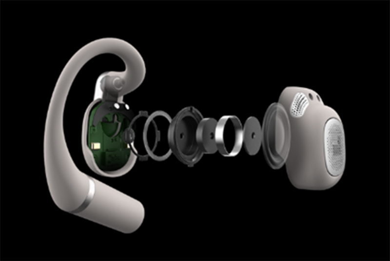 オープンイヤー型特有の問題でもある音漏れについては、独自技術「OpenSoundテクノロジー」にて解消すると説明。ドライバーユニットが前後に振動することで音波の位相が180度異なる逆位相サウンドを生成し、それを意図的に当てることで音の拡散を抑制。これにより音漏れを最小限に抑え、周囲への配慮とプライバシー保護を両立したという。