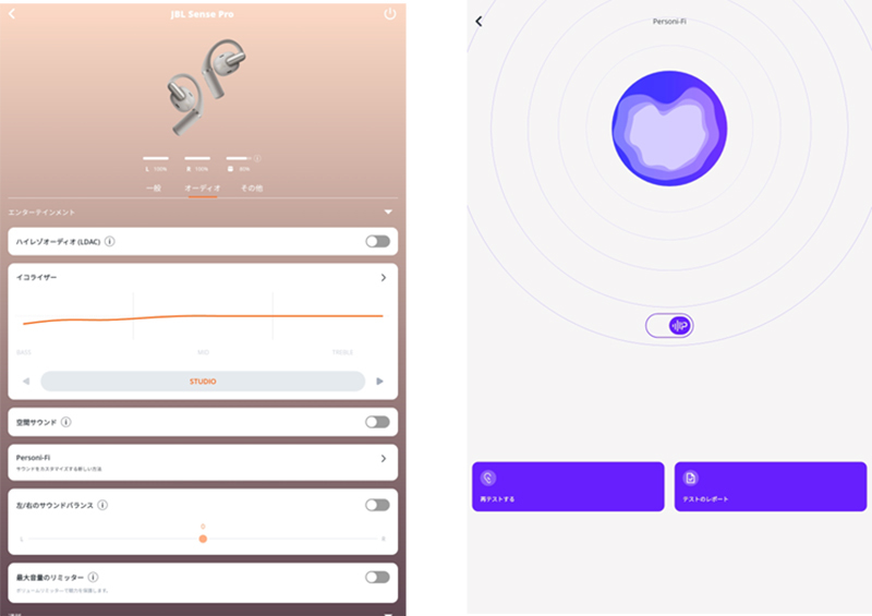 さらに、新たにコンテンツにあわせて臨場感のあるサウンドが楽しめる「空間サウンド機能」や、片耳各12ポイントのヒヤリングテストにより聴覚プロファイルを設定し、パーソナライズされたオーディオ体験を提供する「Personi-Fi 3.0」など、JBL独自機能も搭載している。