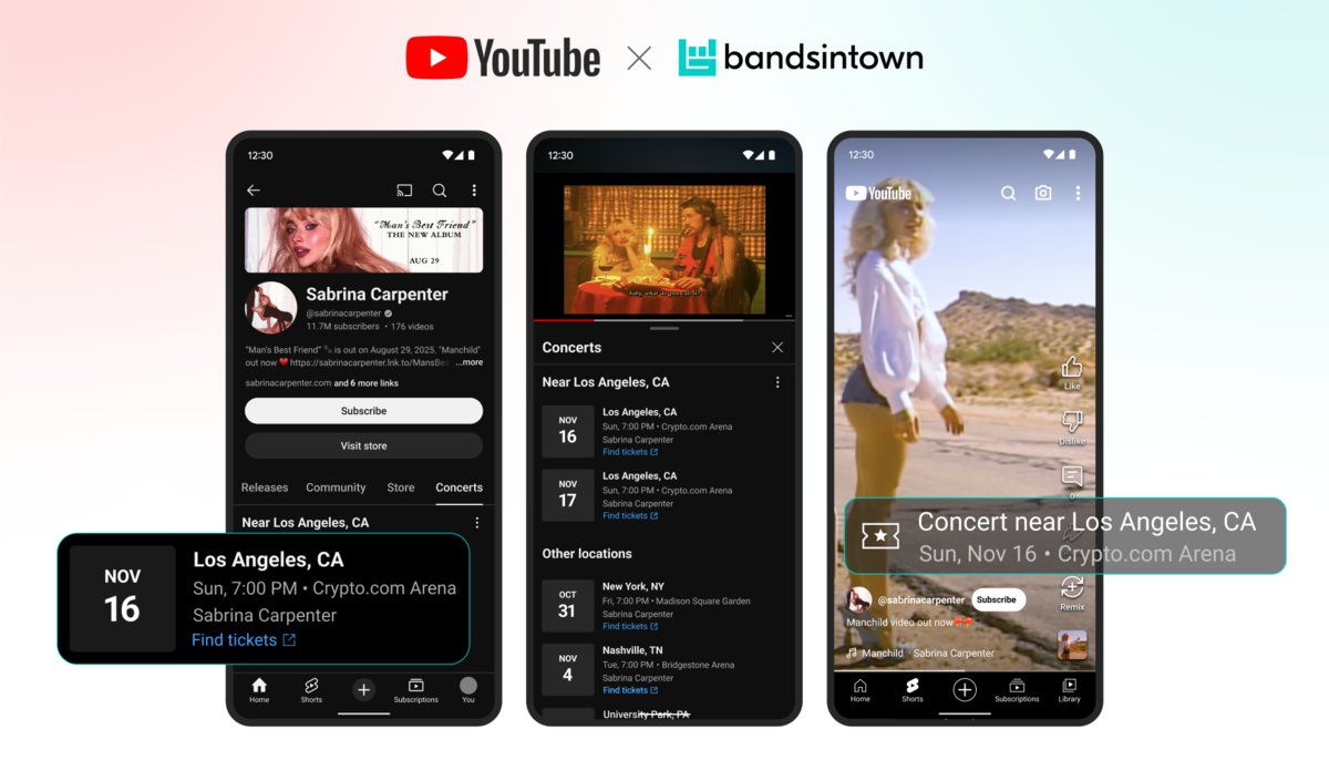 本パートナーシップにより、YouTubeの視聴者はアーティスト動画やショート動画、公式アーティストチャンネルの視聴中、他のアプリへ切り替える必要なく、YouTubeアプリ上で簡単にライブ/コンサート情報を発見できるようになる。YouTube Musicとの連携は今年後半から開始予定で、同様にホーム画面やアーティストページにライブ/コンサート情報が表示されるとのこと。