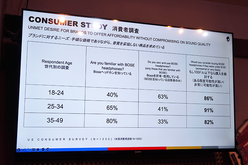 今回のBoseブランドとのパートナシップに至った背景について、アメリカで実施されたBoseとSkullcandyの年代別ブランド認知などについて調査した消費者データによると、Boseは優れた音質の製品を提供するブランドで知られているが、アクティブユース、いわゆる若い消費者層においては高価格帯ゆえに購入対象の製品としてあまり考えられていないことが判明したとする。