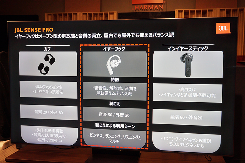 また、オープンイヤー型イヤホンは現在主に「インナーイヤー型」「イヤーカフ型」「イヤーフック型」の3形状に分けられるとして、 “JBL Senseシリーズ” で採用されるイヤーフック型の特徴としては、周囲の音も取り込みつつ、音楽もしっかり聴きたいという2点を両立できる点を挙げた。