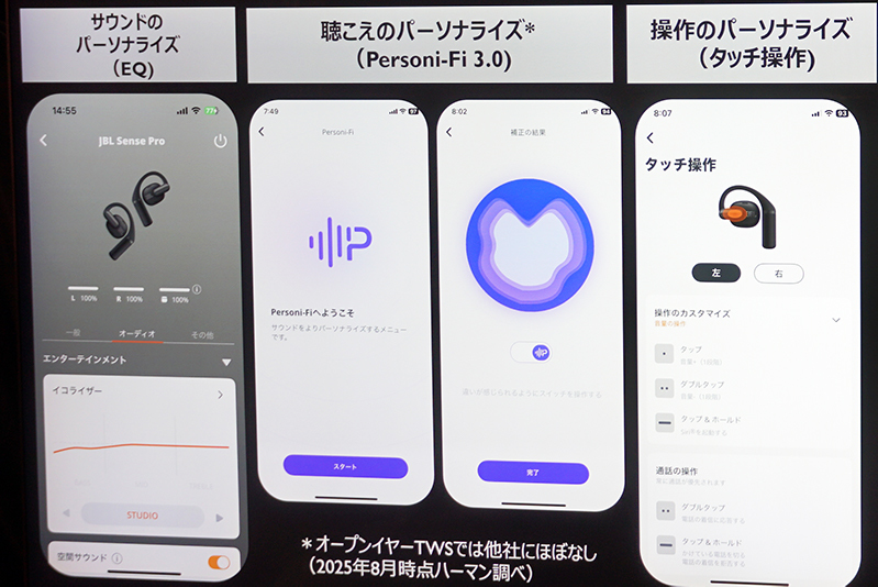 最後に専用アプリ周りでは、各種EQ設定やタッチ操作のカスタマイズなどをサポート。加えて、左右の耳で各9か所から周波数帯の聴覚チェックを行い、ユーザー自身が普段聞こえていない周波数帯を補完して音を再生してくれる「Personi-Fi 3.0」も搭載する。同社調べによれば、オープンイヤーTWSで聴こえのパーソナライズ機能を備える他社製品はまだないとのこと。