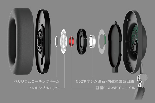 ドライバー駆動部には、CCAWボイスコイルとN52ネオジムマグネットを組み合わせた高効率磁気回路を採用しており、レスポンスの向上、ならびにダイナミックレンジの拡大に寄与している。