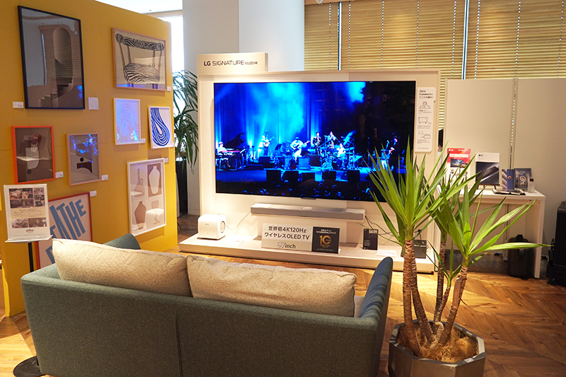 まず大画面テレビシアターでは、LGの97インチ有機ELテレビ「OLED97M5」と、KEFのサウンドバー「XIO」という最新製品の組み合わせを提案した。そして同スペースには、展示ブースに隣接する家具ブランドarflex(アルフレックス)のソファも配置し、快適でゴージャスなホームシアター体験が味わえるリビング空間を演出。