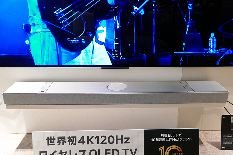 続いてこの大画面シアターのサウンドを担ったKEF「XIO」は、今年7月に発売されたばかりのKEFブランド初のサウンドバー。本展示では上述したZero Connect boxのHDMI端子からテレビとの接続を行い、大画面映像とともにそのサウンドを体感することができた。