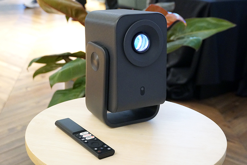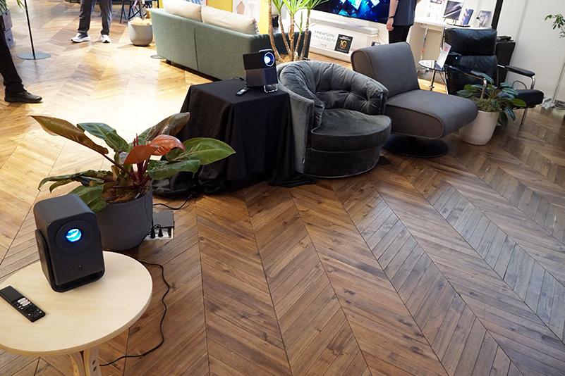 続いて、プロジェクターによる大画面シアター展示では、TCLブランドのスマートプロジェクター3モデルを設置。既に発表されている「C1」に加えて、国内未発表(※記事執筆時点)モデルである「A1s」と「Play Cube」も用意した。なお、A1sとPlay Cubeの視聴デモは本展示が国内初となり、未発表モデルをいち早く体感できる場となった。