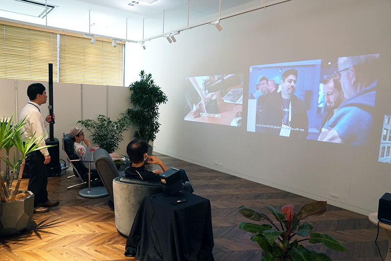 参加者の中からは「(PlayCubeを指して)こんなに小さいんですね!」と、プロジェクターのコンパクトさに驚きの声が挙がることも。「とりあえずポンと置けばいいし、天井に映せるので便利」と、自動調整機能をはじめとする高い利便性も好評だった。また、デザイン性の高さもあってか、スマートフォンで製品の写真を撮られる方も見受けられた。