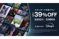 ウォルト・ディズニー・ジャパンは、同社が提供する有料動画配信サービス「Disney+(ディズニープラス)」にて、年間プランの契約が最大5,300円割引になる期間限定キャンペーンを、本日9月11日から9月28日(日)15時59分まで実施する。
