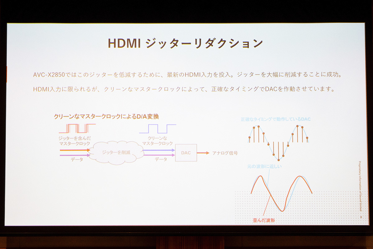 大きな変更点は2つで、1つ目は「HDMIジッターリダクション」機能の導入。HDMI入力回路に新たに搭載されたICによって、マスタークロックに含まれるジッターを低減し、より正確なD/A変換を実現。すべてのHDMIソースに対して作用し、より高精度な映像・音声信号を伝達するという。