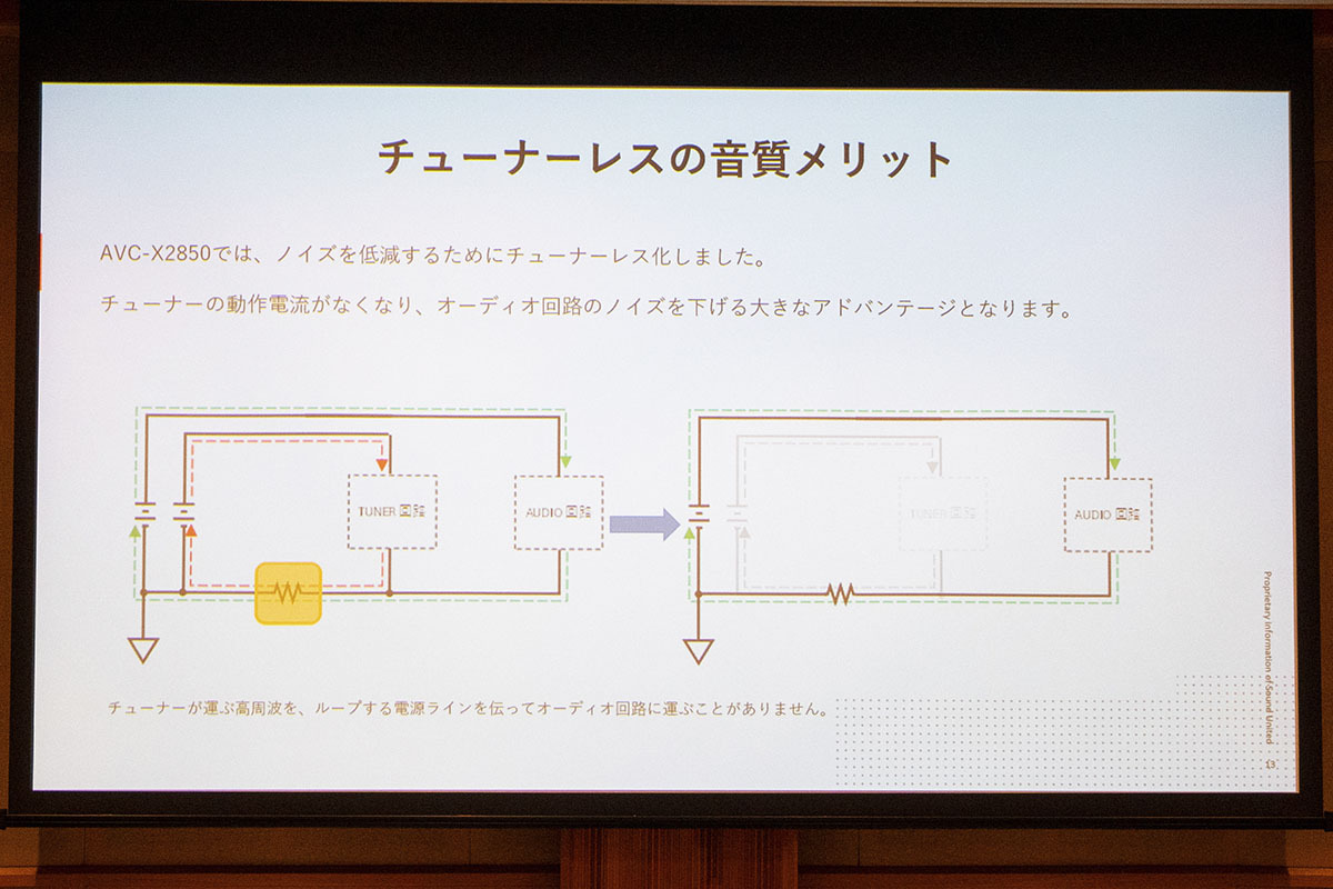 内部構造について、ラジオチューナーを省いたことも大きな特徴。チューナーの動作電源や高周波によるオーディオ回路への干渉をなくすことで、よりピュアな信号伝達を実現したとしている。AVR-X2800HとAVC-X2850Hの「R」と「C」の違いはこの部分に起因しており、本モデル・AVC-X2850Hはチューナー、すなわちレシーバー(R)機能のないAVセンター(C)という位置付けとなっている。