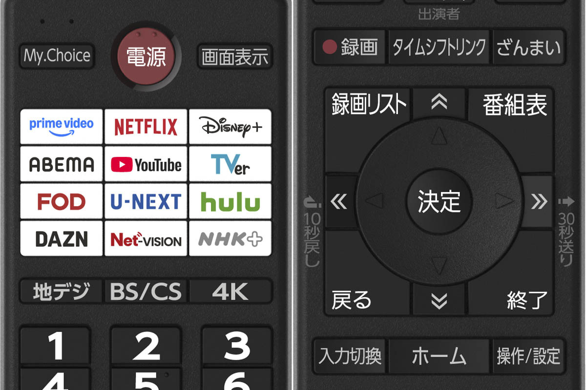 付属のリモコンには、YouTube/Prime Video/Netflix/Disney+/NHK+/U-NEXT/ABEMA/TVer/FOD/hulu/DAZN/Net-VISIONの合計12種類のサービスにダイレクトでアクセスできるボタンを装備。また、任意のネット動画サービスやHDMI入力端子などを登録し、ボタンひとつで起動できる「My.Choice」ボタンも備えている。