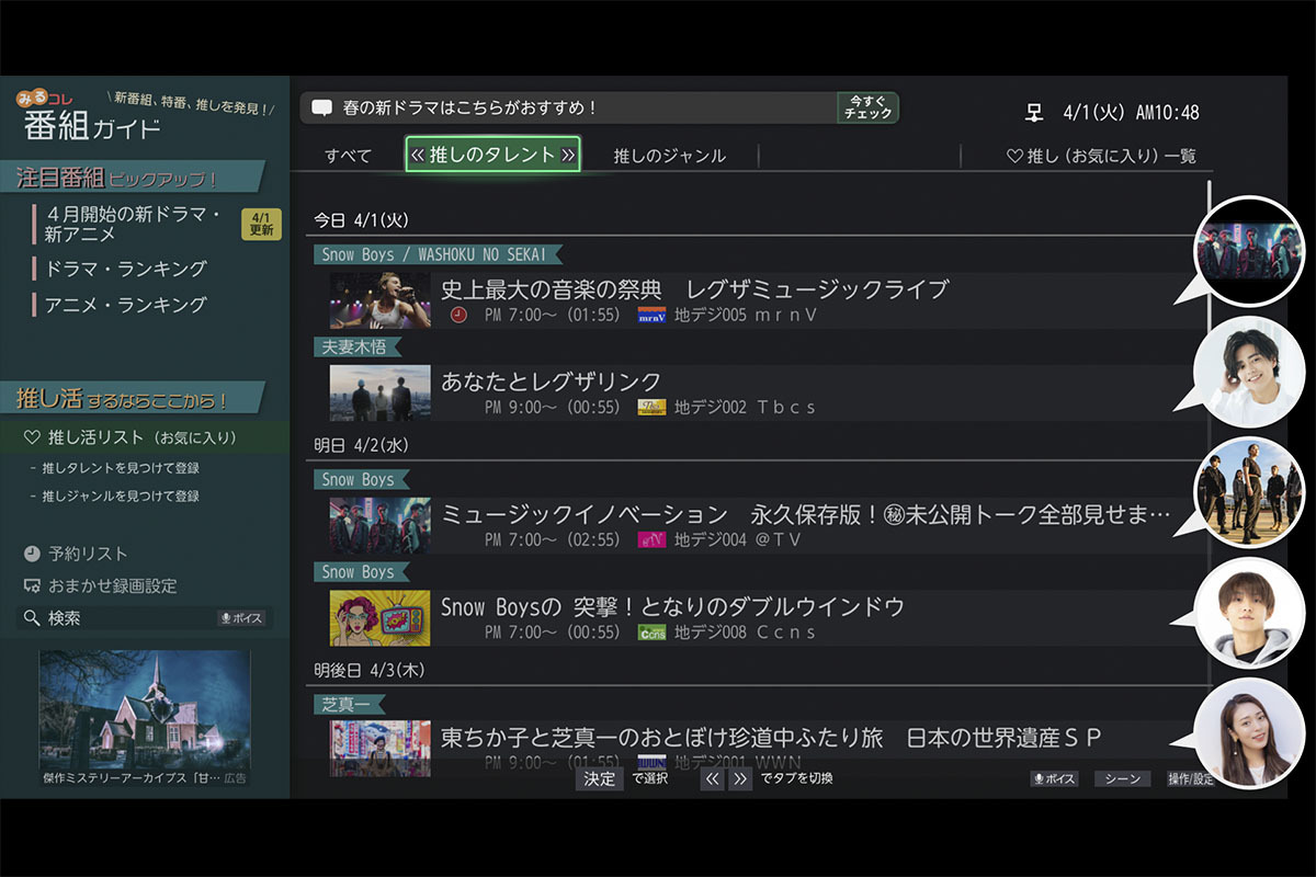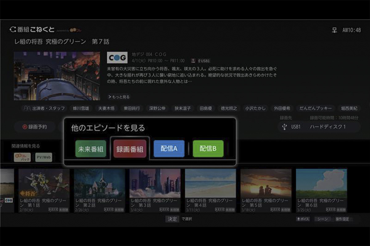便利機能として、“推し活” を強力にサポートする「みるコレ」を搭載。お気に入り登録したテーマに関連した番組やシーン、ネット動画を横断して検索・表示する「みるコレパック」をはじめ、お気に入り追加したタレントの番組やシーン、ネット動画をすぐに見られる「ざんまいスマートアクセス」、録画番組の再生中に見たいシーンにすばやくアクセスできる「シーンリスト表示」、各話や出演者といった番組情報から配信先まで簡単にチェックできる「番組こねくと」、その時期に合わせた放送予定のおすすめ番組をチェックできる「みるコレ番組ガイド」など多種多様な機能を備える。