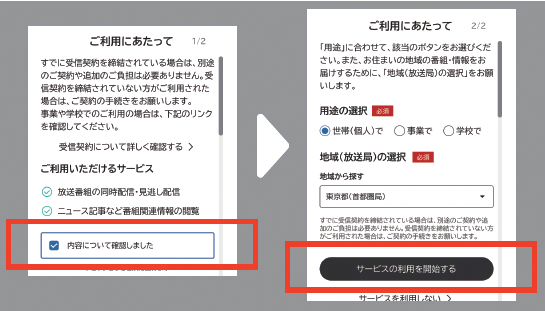 10月1日以降、ラジオ関連サービスを除くNHK ONEのサービス(同時・見逃し配信やニュース記事など)にアクセスすると、サービス利用には受信契約が必要であることを知らせる「ご利用にあたって」画面が表示されるようになる。内容について確認した上で、「サービスの利用を開始する」ボタンを押すことにより、すぐにサービスを利用できるようになる。