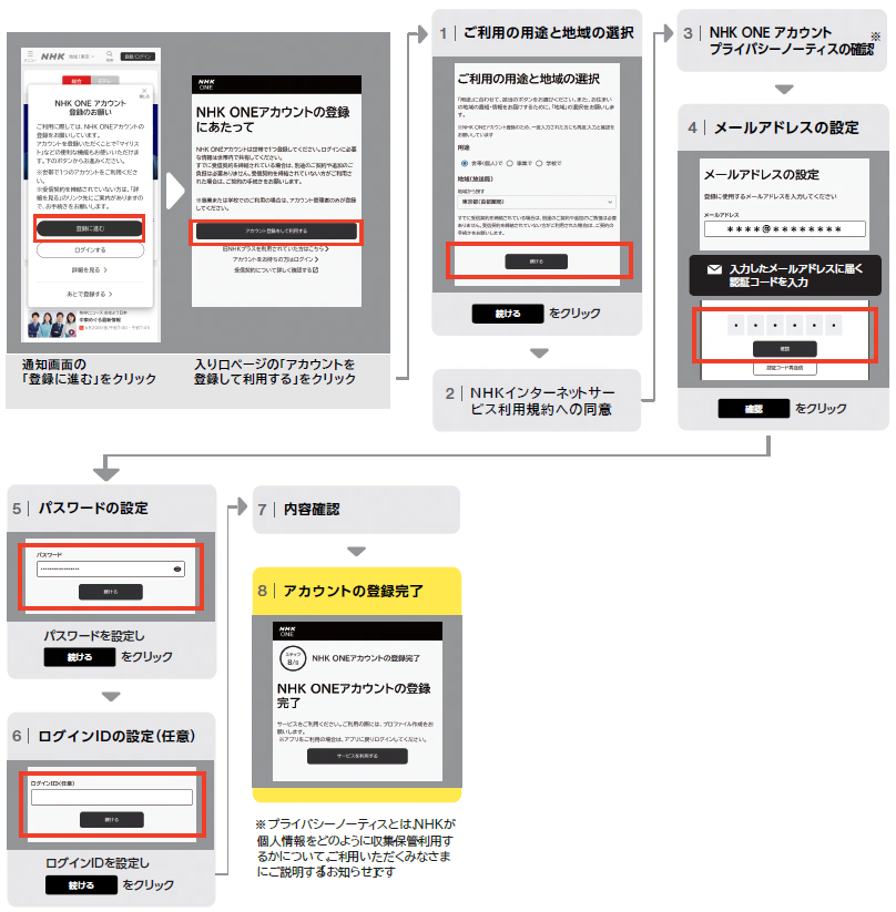 新規にアカウントを登録する場合は、NHK ONEアカウント登録の入口画面から「アカウントを登録して利用する」をクリックし、パスワードの設定やログインIDの設定など、8ステップの登録作業を進めることでアカウントを作成できる。