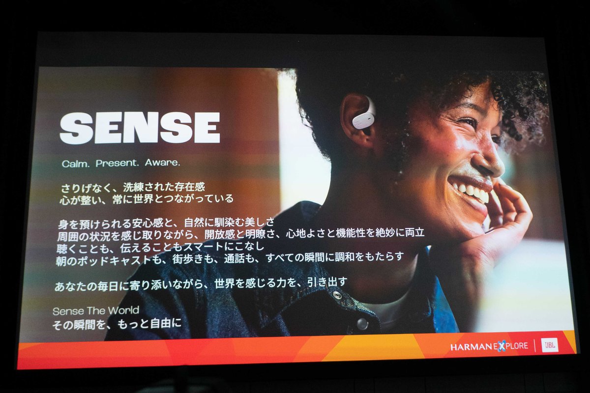 完全ワイヤレスイヤホンのなかでも、“ながら聴き” の代名詞ともいえる「オープンイヤー型イヤホン」がトレンドとなる昨今、JBLからも “SENSEシリーズ” がラインナップに追加されたが、「ちゃんと音楽・映像コンテンツを楽しみながら、学びを感じられる」、そして「オープンイヤー型イヤホンとしても音質と装着感にこだわっている」とアピールした。