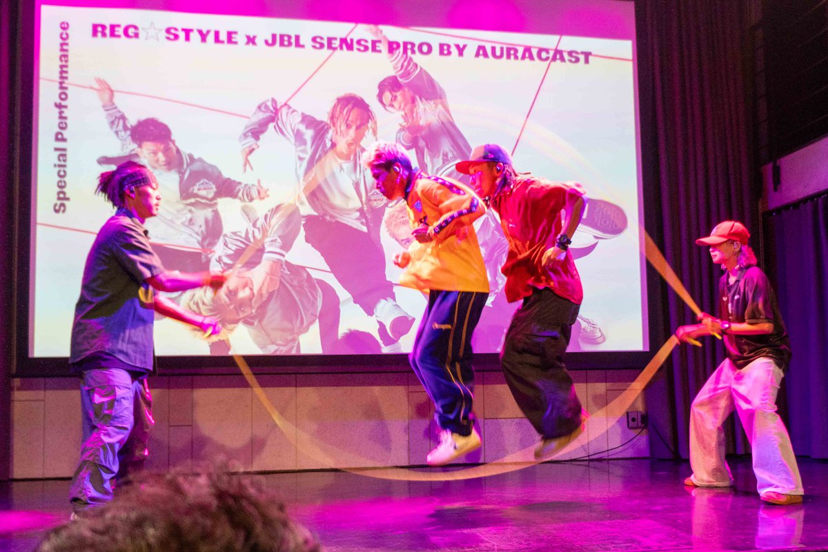 会場では、プロのダブルダッチチーム「REG☆STYLE」のメンバー全員に、実際にJBL Sense Proを装着してもらい、スピーカーが無い環境下においても、イヤホンから聴こえる音によって、息がぴったりと合ったパフォーマンスが可能であることをデモンストレーションしていた。