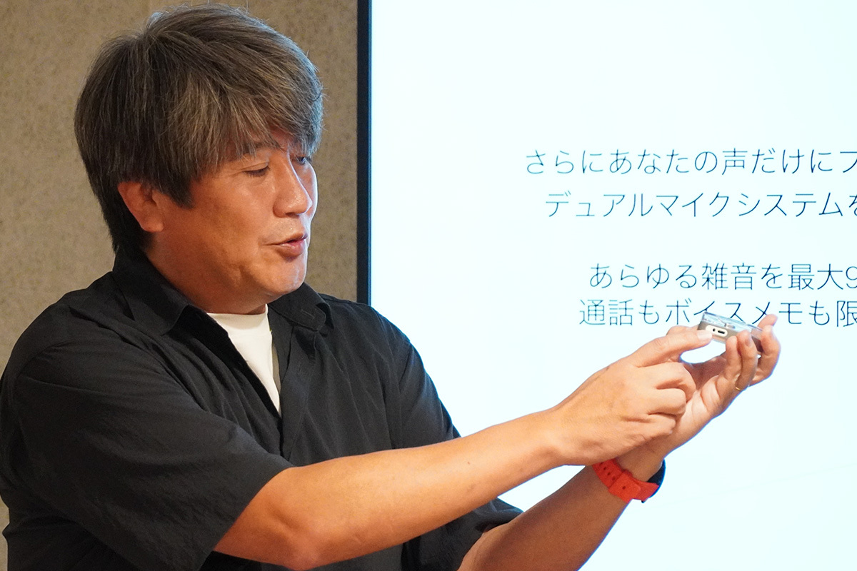 スーパーマイクは充電ケース側面の「TALK」ボタンを長押ししている間オンになるほか、短く2回押すことで入れっぱなしの状態にすることも可能。同社のエコシステムEssential Space(エッセンシャルスペース)により、文字起こしまで対応するとアピールしていた。